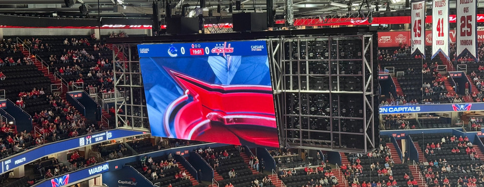 A Capitals game at Capital One Arena is a fantastic experience, starting before the puck is even dropped. A few minutes before the pregame, fog will descend from the rafters of the arena. While this may seem odd, it does serve a purpose. When the pregame starts, the lights will go out in the arena as spotlights shine through the fog, creating patterns on the ice and in the air. Meanwhile, graphics, including the Capitals' logo and video of Caps players, will be projected onto the ice itself. The team is introduced, the anthem plays as an American flag projects onto the ice, and the puck drops.