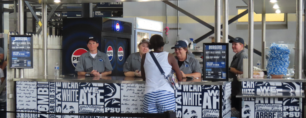The concession stands at Beaver Stadium offer a mix of generic stands and specialty stands featuring food offerings from local restaurants, including Caliente Pizza, Chickie and Pete’s, Doan’s Bones, Panini’s, Philly Pretzel Factory, Scott’s Roasting, and Wing Kitchen.