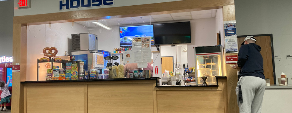 The facility’s snack bar, The Ice House Café, is located between the red and blue rinks on the mezzanine level. Several tables fill the large space, and both rinks are visible from these tables. Also, there are a bunch of video games, an air hockey table, and a rod hockey table located here. As is the case with many community rinks, this snack bar features a pretty impressive menu.