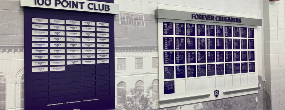 Plaques in the Hart Rink commemorate significant individuals in Crusader hockey history, and banners hang in the rink honoring conference titles and tournament appearances. Displays honor every player to play for the Crusaders and all the program’s 100-point scorers.