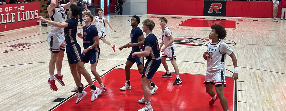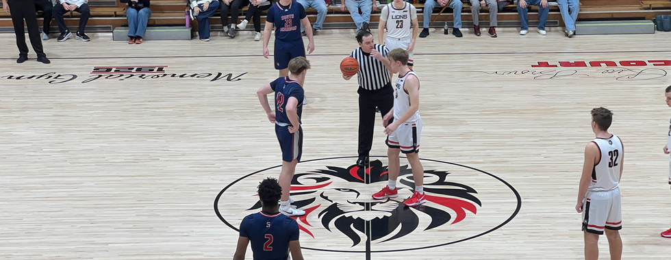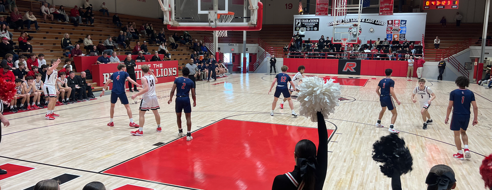 The varsity team charges onto the court, followed closely by cheerleaders waving flags. The crowd rises as one, clapping and cheering for the Lions. The band erupts with energy as players are introduced over the P.A. system. Home supporters fill much of the seating, visiting fans gather in their designated section, and the student section packs in behind the baskets opposite the stage.