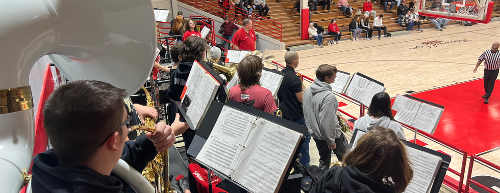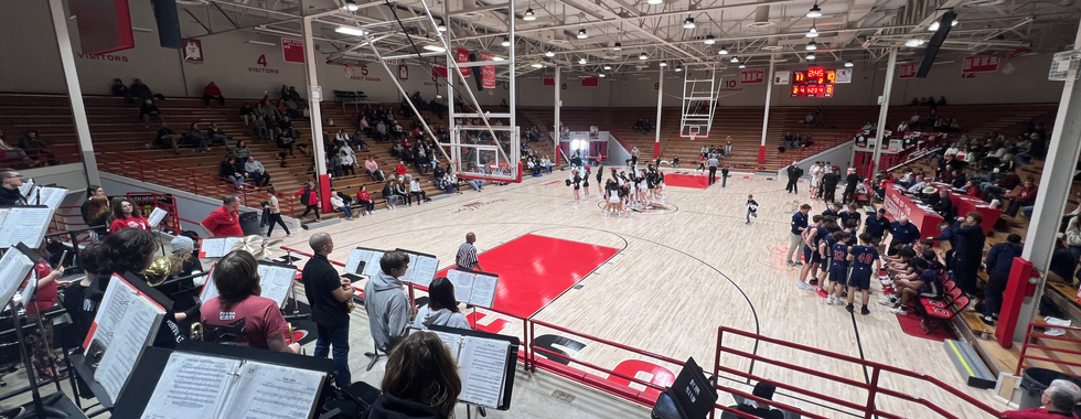 The small-town atmosphere is unmistakable in the moments leading up to the varsity game. The band assembles on the stage while fans drift in from the main entrance, making their way to their seats. The anticipation builds steadily—soon, it will be time for tip-off.