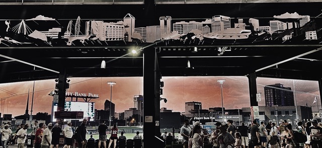 Other hidden gems include the use of Islamic Muqarnas as inspiration for the screen wall, lenticular artwork infused into the third base parking lot fence, and in this writer’s opinion, the masterpiece, a stainless mirror image sculpture of the skyline that is attached to the back side of the press box, where fans can see the actual Wichita skyline and it’s model lined up together, with the summer sky and playing field in the background. This view is worth the price of admission alone, and can go unseen unless brought to one's attention.