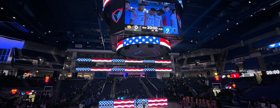 The videoboard comes in handy during pre-game introductions, including DIBS (Demon in a Blue Suit) waving the team flag, and flanked by cheerleaders and fire. He revs the crowd up and can be found on the sidelines and in the stands throughout the game. Cheerleaders entertain fans during breaks in the action on the court, and the band adds the soundtrack to the game.
